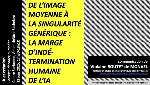 Communication dans le cadre de la journée d’étude IA et création : encoder, décoder, surcoder, Université Paris 1 Panthéon-Sorbonne, Amphithéâtre Bachelard, 13 juin 2025, 17h30-18h10.